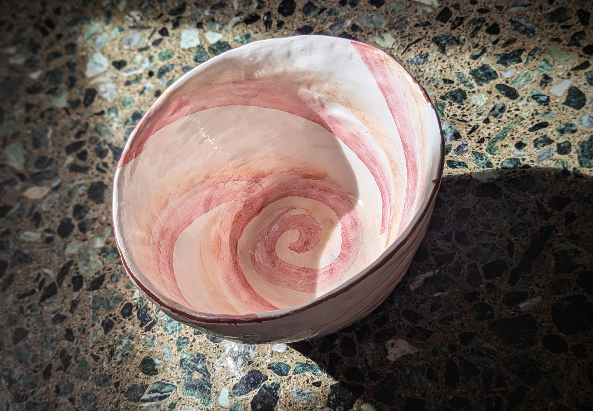 Terracotta ramen bowl with small base, white and pink, decorated with phalluses etched on slip.